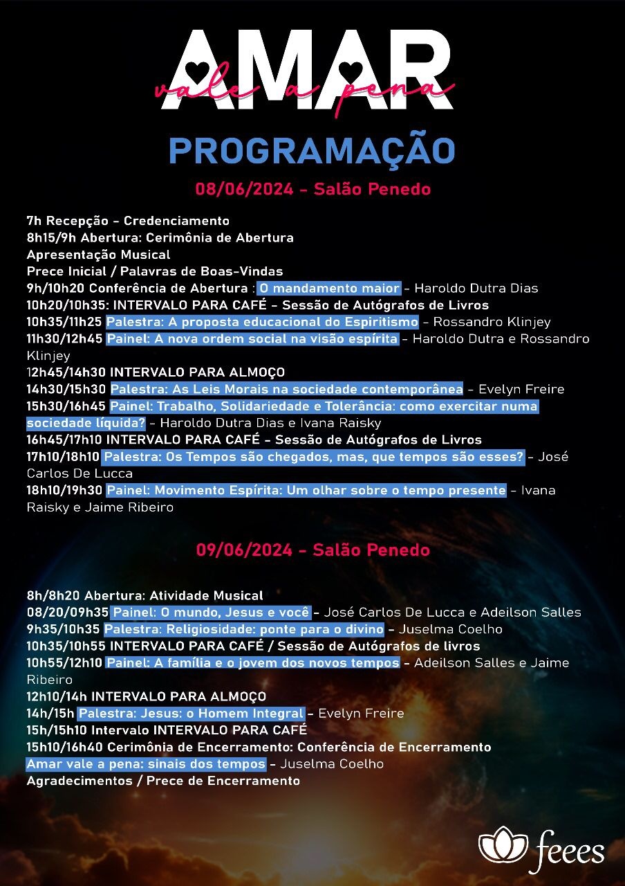 Neste contexto, para o 15º Congresso Espírita do Estado do Espírito Santo a proposta para o tema central é AMAR vale a pena – sinais dos tempos: cuidar de si, cuidar do outro, cuidar do planeta.