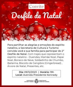 A secretaria pede para que os cidadãos ornamentem suas residências e comércios, com luzes e enfeites natalinos, trazendo a alegria e a magia do Natal para seus lares e locais de trabalho. “Aproveite a época mais festiva e fraternal do ano e ornamente suas vitrines e fachadas use a sua criatividade e mostre a todos o seu talento e espírito natalino. Vamos tornar esta data ainda mais especial e inesquecível”, disse a Secretaria de Cultura e Turismo, Maria Goretti.