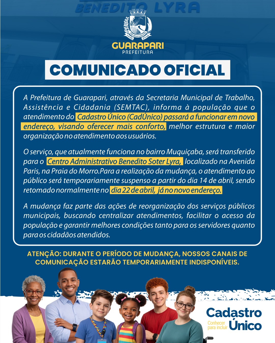 A Prefeitura de Guarapari informa que o atendimento do Cadastro Único (CadÚnico) passará a funcionar em novo endereço, no Centro Administrativo Benedito Soter Lyra, localizado na Avenida Paris, na Praia do Morro.