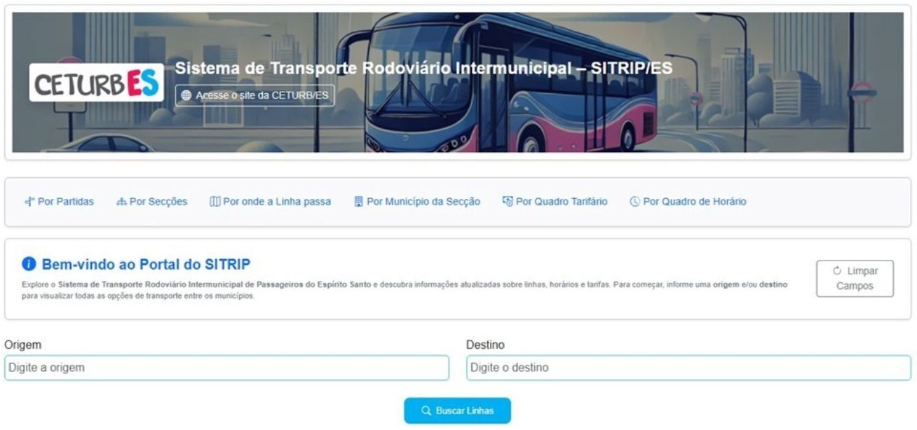 Está disponível no site da Companhia Estadual de Transportes Coletivos de Passageiros do Espírito Santo (Ceturb-ES) o novo portal do Sistema de Transporte Rodoviário Intermunicipal (Sitrip), desenvolvido pela Gerência de Informática (Geinf) da Companhia. O novo espaço virtual pode ser encontrado na área lateral do site da Ceturb-ES, ao clicar na aba “Transporte Rodoviário Intermunicipal” e em “Quadro de Horários” ou “Quadro de Tarifas”.