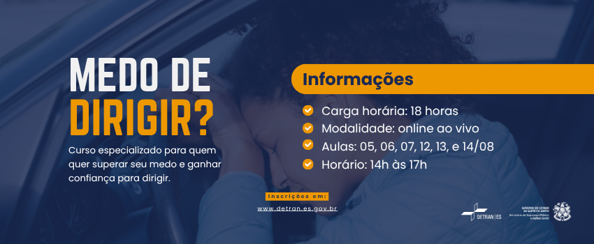 O curso é gratuito e será realizado pela Escola Pública de Trânsito (EPT) entre os dias 05 e 14 de agosto, das 14h às 17h. As aulas serão no formato Ensino a Distância (EaD), ao vivo, e poderão ser feitas por pessoas de todo o Estado habilitadas ou não e que tenham interesse em superar seu medo de dirigir ou até mesmo de dar início ao processo de habilitação.