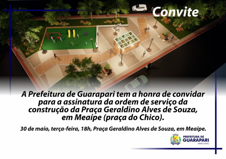 A Prefeitura de Guarapari, através da Secretária de Obras Públicas (SEMOP), realizará nesta terça-feira (30), às 18h, a cerimônia de Ordem de Serviço para a Construção da Praça Geraldo Alves de Souza, em Meaípe, popularmente conhecida como “Praça do Chico”.