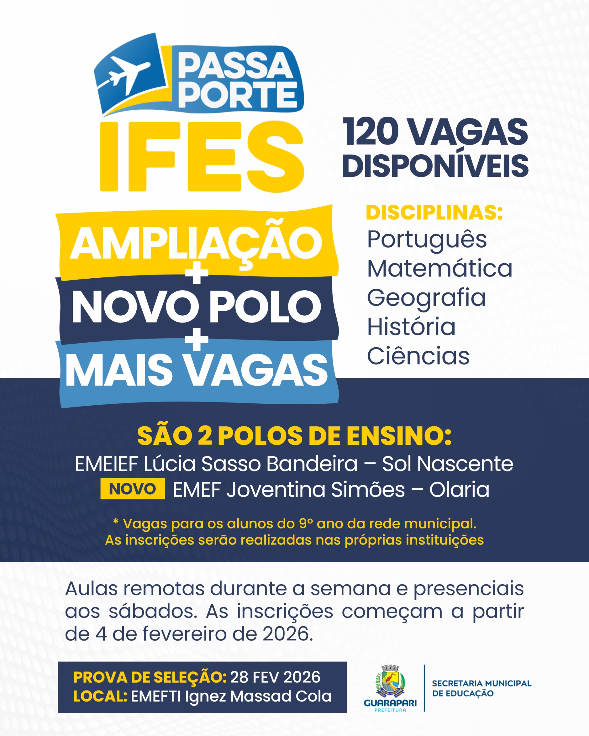 A Prefeitura de Guarapari, por meio da Secretaria Municipal de Educação, anuncia a ampliação do programa Passaporte IFES em 2026, consolidando a iniciativa após os resultados expressivos obtidos no projeto piloto realizado em 2025. Neste novo ano, o programa dobra o número de vagas e passa a contar com dois polos de ensino, ampliando o acesso e fortalecendo a preparação dos estudantes da rede municipal para o ingresso no Instituto Federal do Espírito Santo (IFES).
