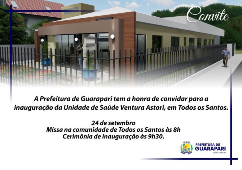 A Prefeitura de Guarapari, através da Secretaria de Obras Públicas (SEMOP), realizará no próximo domingo (24), às 09h30, a cerimônia de Inauguração da unidade de saúde Ventura Astori, em Todos os Santos. A nova unidade é mais uma obra de qualidade, que o Município irá entregar às famílias de Todos os Santos, Santa Luzia, Santa Rita e comunidades vizinhas.